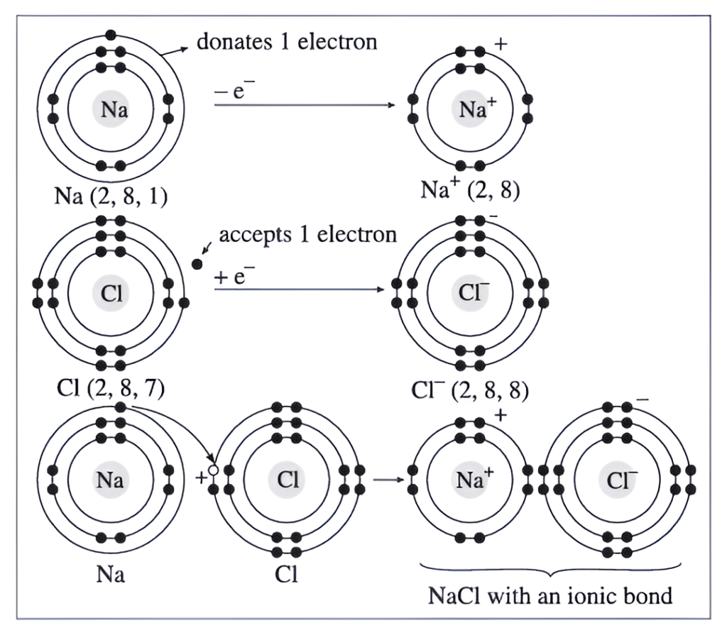 (4) Due to this, the sodium and chlorine atoms become positive and negative ions respectively. This results in the formation of an ionic bond between the two ions, due to electrostatic force of attraction, giving rise to ionic compound sodium chloride.