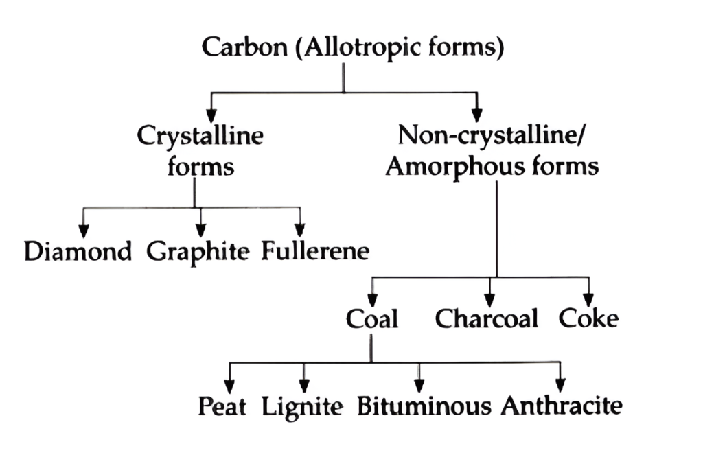 | (i) A crystalline form has a regular and definite arrangement of atoms. (ii) They have high melting points and boiling points. (iii) A crystalline form has a definite geometrical shape, sharp edges and plane surfaces. (iv) Diamond, graphite and fullerene are different crystalline forms of carbon. | (i) A non-crystalline form does not have a regular and definite arrangement of atoms. (ii) They have low melting points and boiling points. (iii) They are amorphous, hence, they do not have definite geometrical shape. (iv) Coal, charcoal and coke are different noncrystalline/amorphous forms of carbon. |