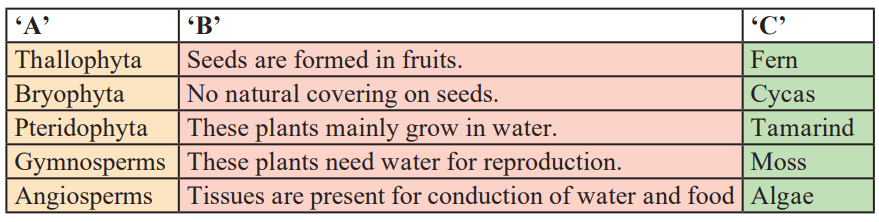 | Pteridophyta | Tissues are present for conduction of water and food (Vascular plants without seeds). | Fern |