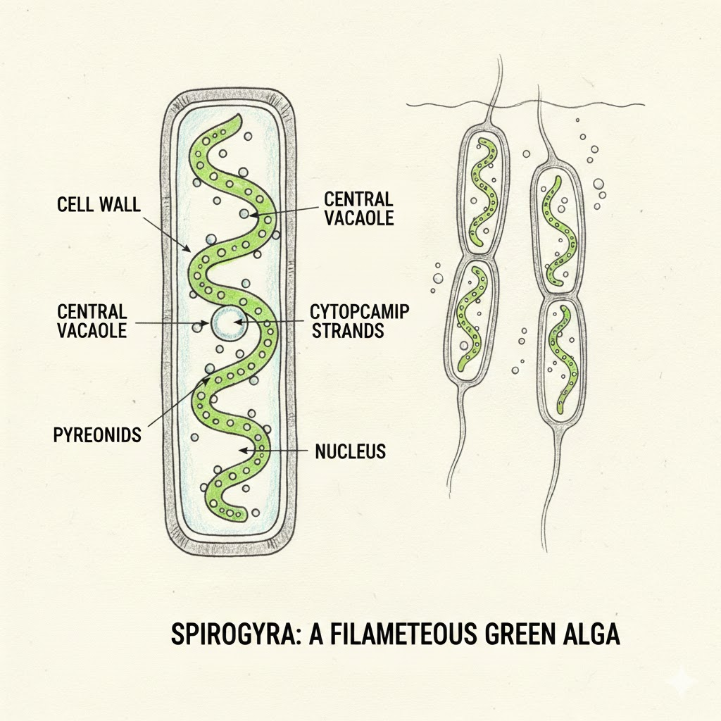 (1) Spirogyra is a green filamentous alga belonging to the division Thallophyta.