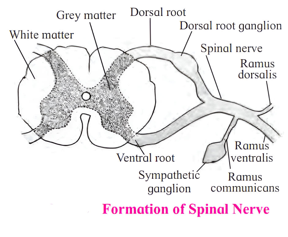 (4) Motor neuron (effector) : The cyton of motor neuron is present in the ventral horn of grey matter and axon travels through ventral root. It conducts motor impulse from spinal cord to effector organ.