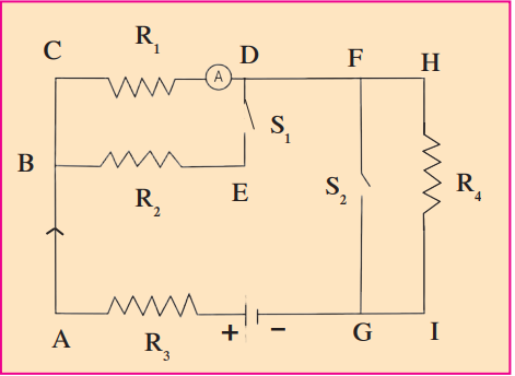 (b) When both S1 and S2 are open, the effective resistance of the circuit increases and hence, current will decrease.