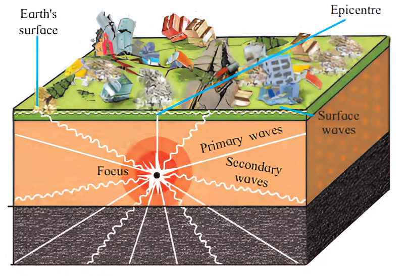 When the intension is released at the focus, the released energy travels in all directions. This energy comes towards the Earth’s surface in the form of waves. The seismic waves can be divided into primary, secondary and surface waves.