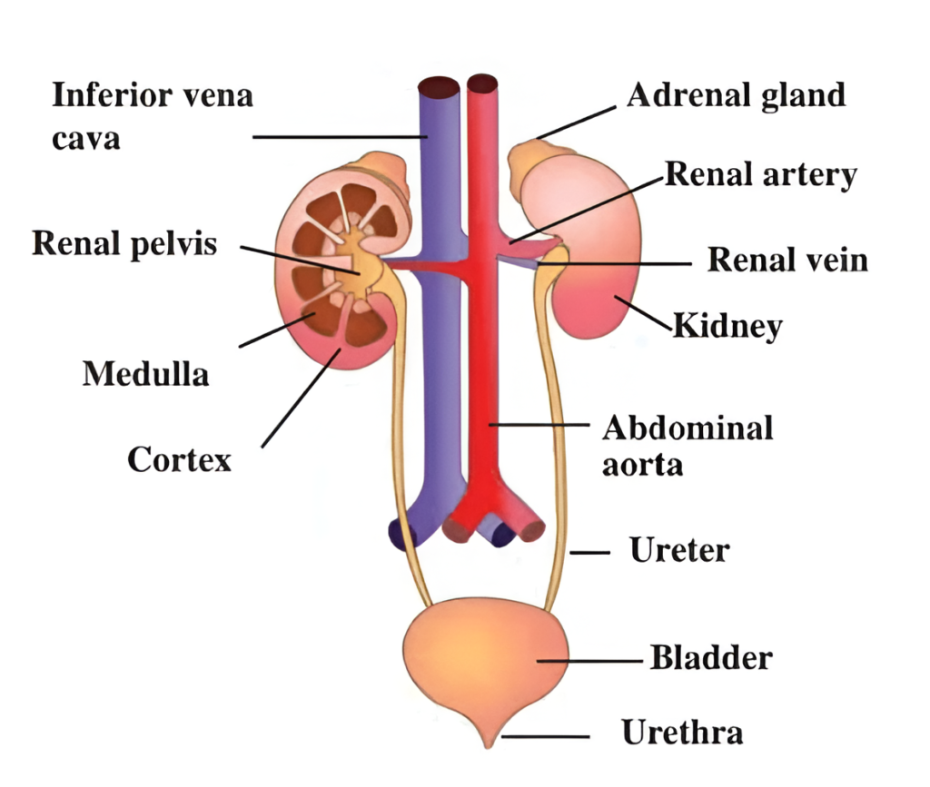 - The human excretory system consists of a pair of kidneys, a pair of ureters, the urinary bladder and the urethra. Urine is formed by the kidneys by separating the waste and unwanted excess substances from the blood.