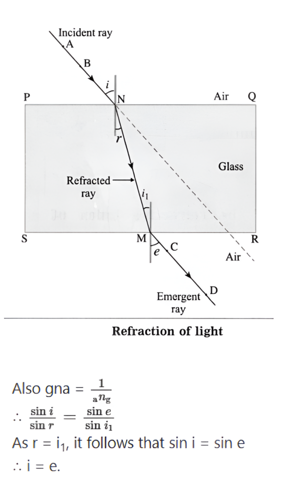 a. If the angle of incidence and angle of emergence of a light ray falling on a glass slab are i and e respectively, prove that i = e.
