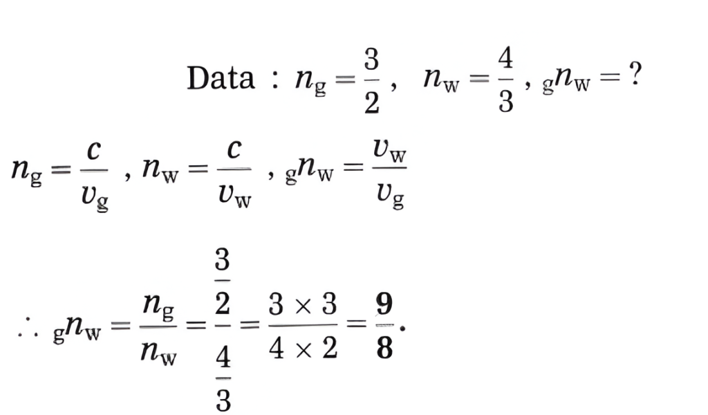 b. If the absolute refractive indices of glass and water are 3/2 and 4/3 respectively, what is the refractive index of glass with respect to water?