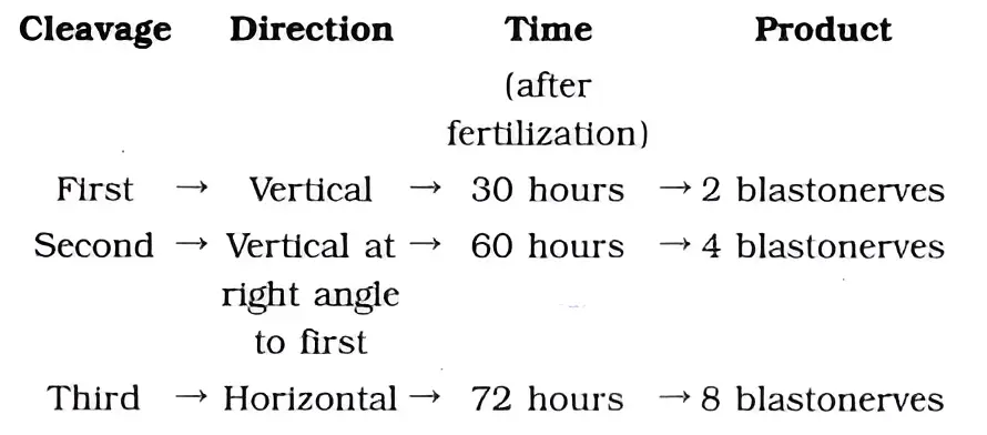 (1) Cleavage is a rapid mitotic division to form a blastula. These divisions takes place immediately after fertilization. The cells formed by cleavage are called blastomeres.