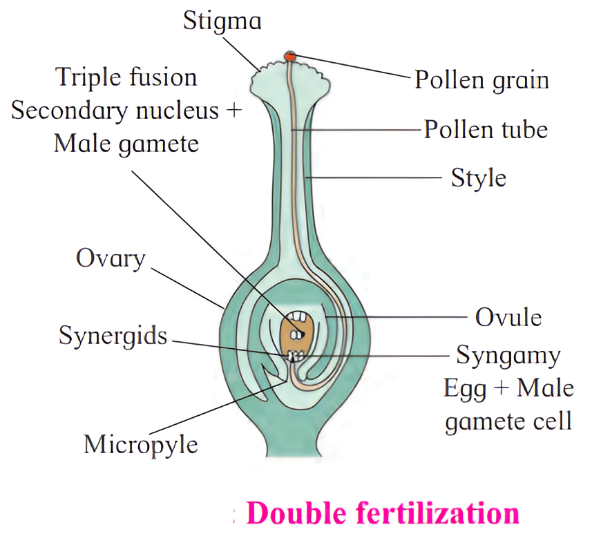 (1) Out of the two male gametes produced by the male gametophyte in angiosperms, one unites with the female gamete and the other with the secondary nucleus. Since both the male gametes take part in fertilization and fertilization occurs twice, it is called double fertilization.