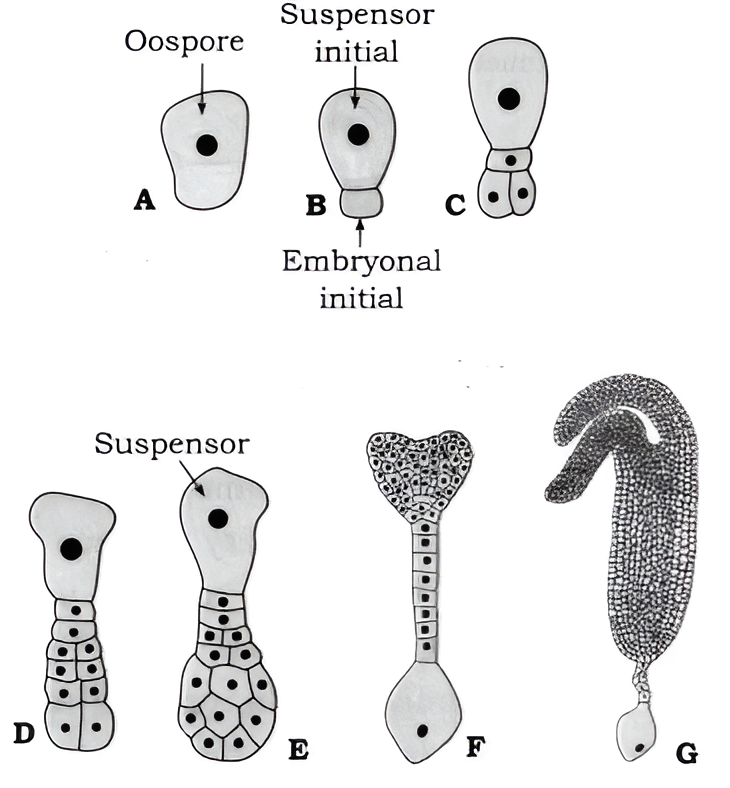 The oospore undergoes a transverse division to form a large basal cell towards the micropyle and a small apical or terminal cell towards the chalaza of the embryo sac. This two celled structure is called proembryo. The basal cell or suspensor initial undergoes repeated transverse divisions to form a multicellular structure called suspensor. The suspensor pushes the embryo towards the endosperm to draw its nutrition.