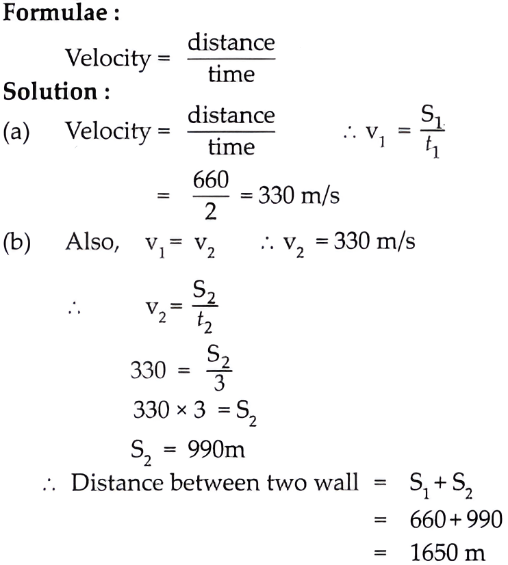 c. Sunil is standing between two parallel walls. The wall closest to him is at a distance of 660 m. If he shouts, he hears the first echo after 4 s and another after another 2 seconds.