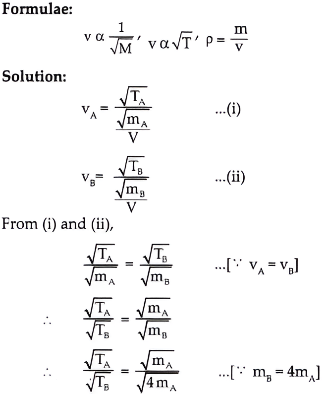 e. Helium gas is filled in two identical bottles A and B. The mass of the gas in the two bottles is 10 gm and 40 gm respectively. If the speed of sound is the same in both bottles, what conclusions will you draw? (Ans: Temperature of B is 4 times the temperature of A.)