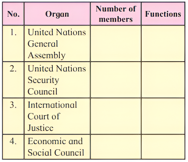 (1) Complete the following chart giving information about the organs of the United Nations.