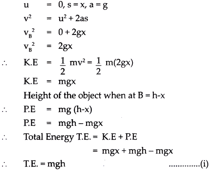 As shown in the figure, the point A is at a height (h) from the ground. Let the point B be at a distance V, vertically below A. Let the point C be on the ground directly below A and B. Let us calculate the energies of the object at A, B and C.