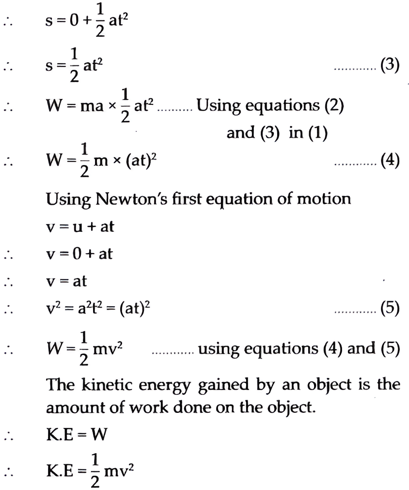 Suppose a stationary object of mass ‘m’ moves because of an applied force. Let ‘u’ be its initial velocity (here u = 0). Let the applied force be ‘F’. This generates an acceleration a in the object, and after time T, the velocity of the object becomes equal to ‘v’. The displacement during this time is s. The work done on the object is