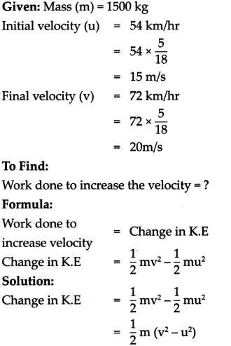 d. The velocity of a car increases from54 km/hr to 72 km/hr. How much is the work done if the mass of the car is 1500 kg ? (Ans. : 131250 J)